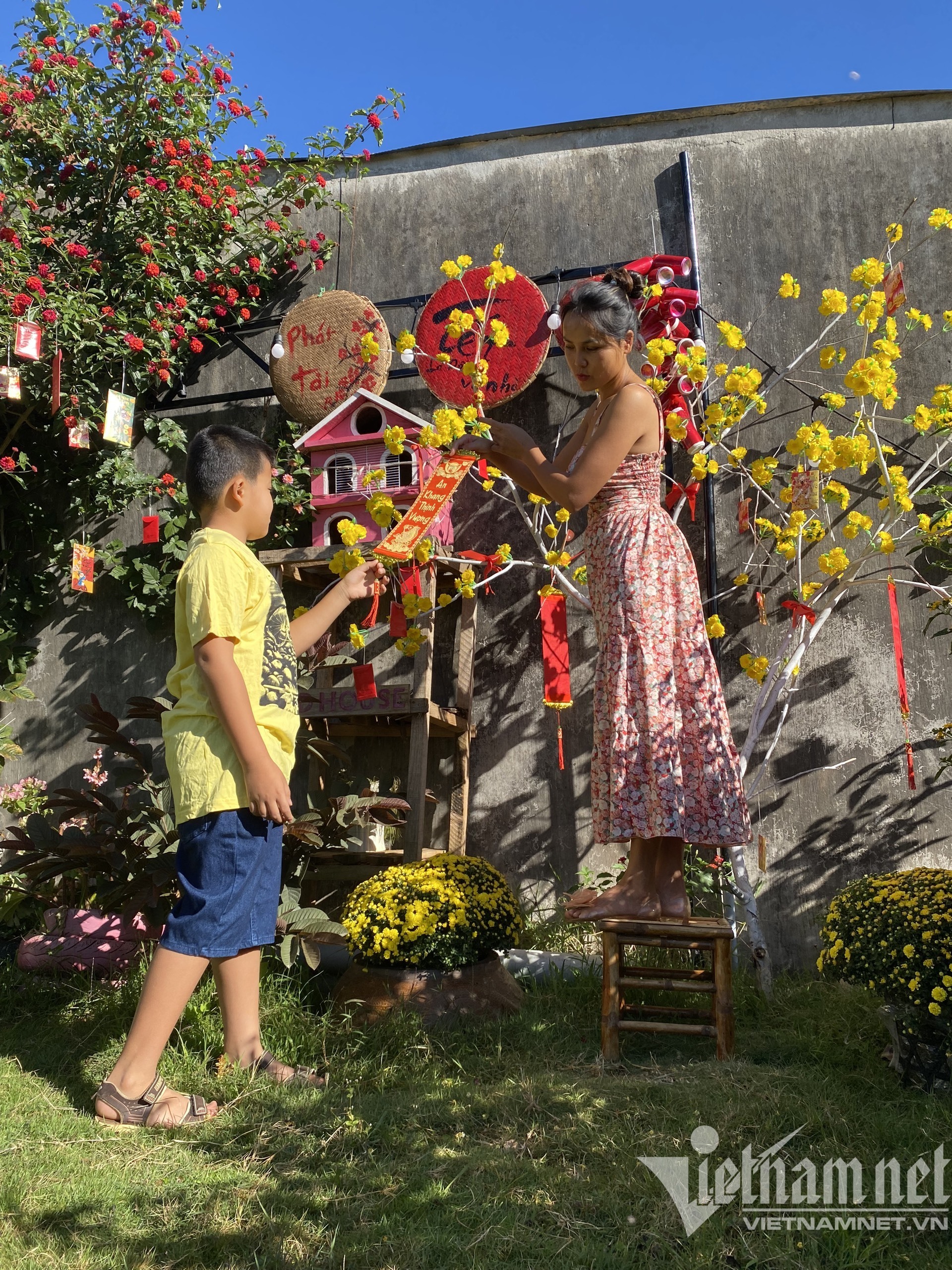 Những chiếc đèn lồng, câu đối, pháo giấy, lì xì… được chị Phước và con trai khéo léo bày biện, tạo nên những góc xinh xắn trong vườn. Hai mẹ con vừa làm vừa tỉ tê “buôn chuyện”, tiếng cười giòn tan.