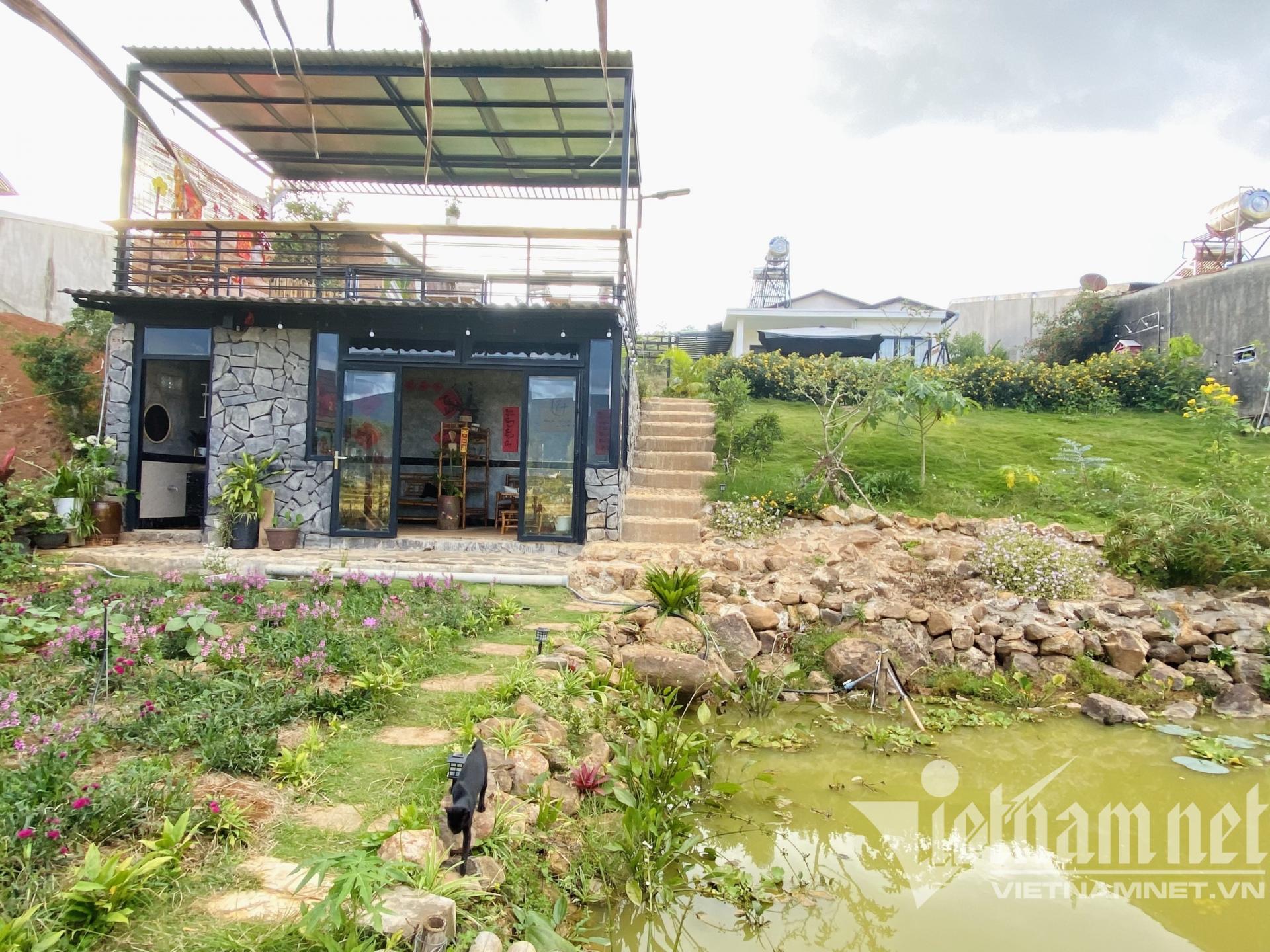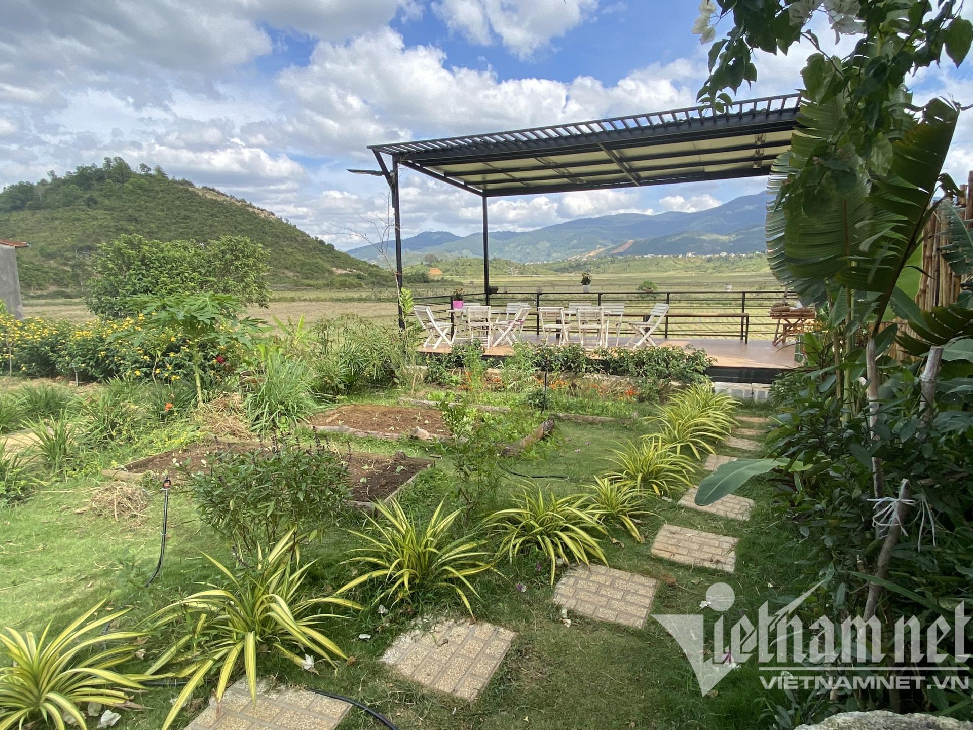 Mảnh đất của mẹ con chị Phước rộng khoảng 900m2 tại Di Linh, Lâm Đồng, nơi có khí hậu mát mẻ, không khí trong lành. Một mặt của khu đất tiếp giáp đường giao thông, một mặt hướng về cánh đồng “thẳng cánh cò bay”. Thế đất hơi dốc về phía cánh đồng nên chị Phước xây dựng thành 3 khu khác nhau.
